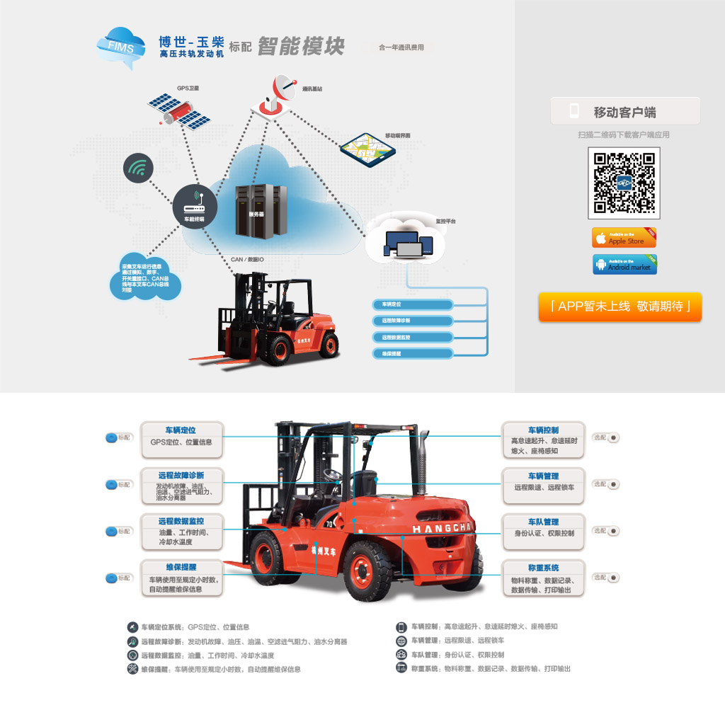 ● 云智能叉車管理系統是應用先進的物聯網和互聯網技術,結合人工叉車實現車輛數據采集、車輛報警、車輛遠程控制和診斷、車輛調度、物流跟蹤等功能,幫助用戶進行車輛管理,智能調度和智能物流管控,提升企業設備管理和物流管理水平,叉車云智能終端可無縫對接云智能叉車管理系統。